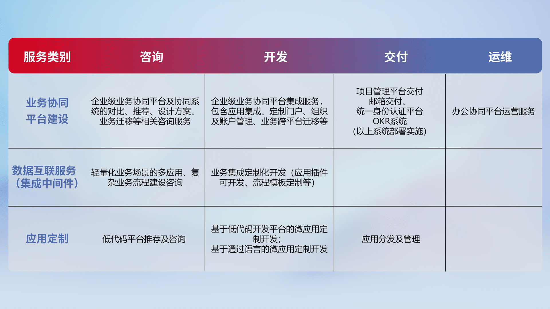 针对钉钉、、企微、、、、IDaas等平台级产品提供产品的规划、、方案、、交付、、、、定制化开发等服务,,实现如统一协同办公、、、、智能客户服务、、、、混合会议管理、、、、智能数据查询、、、等业务场景,,实现数字化转型。。