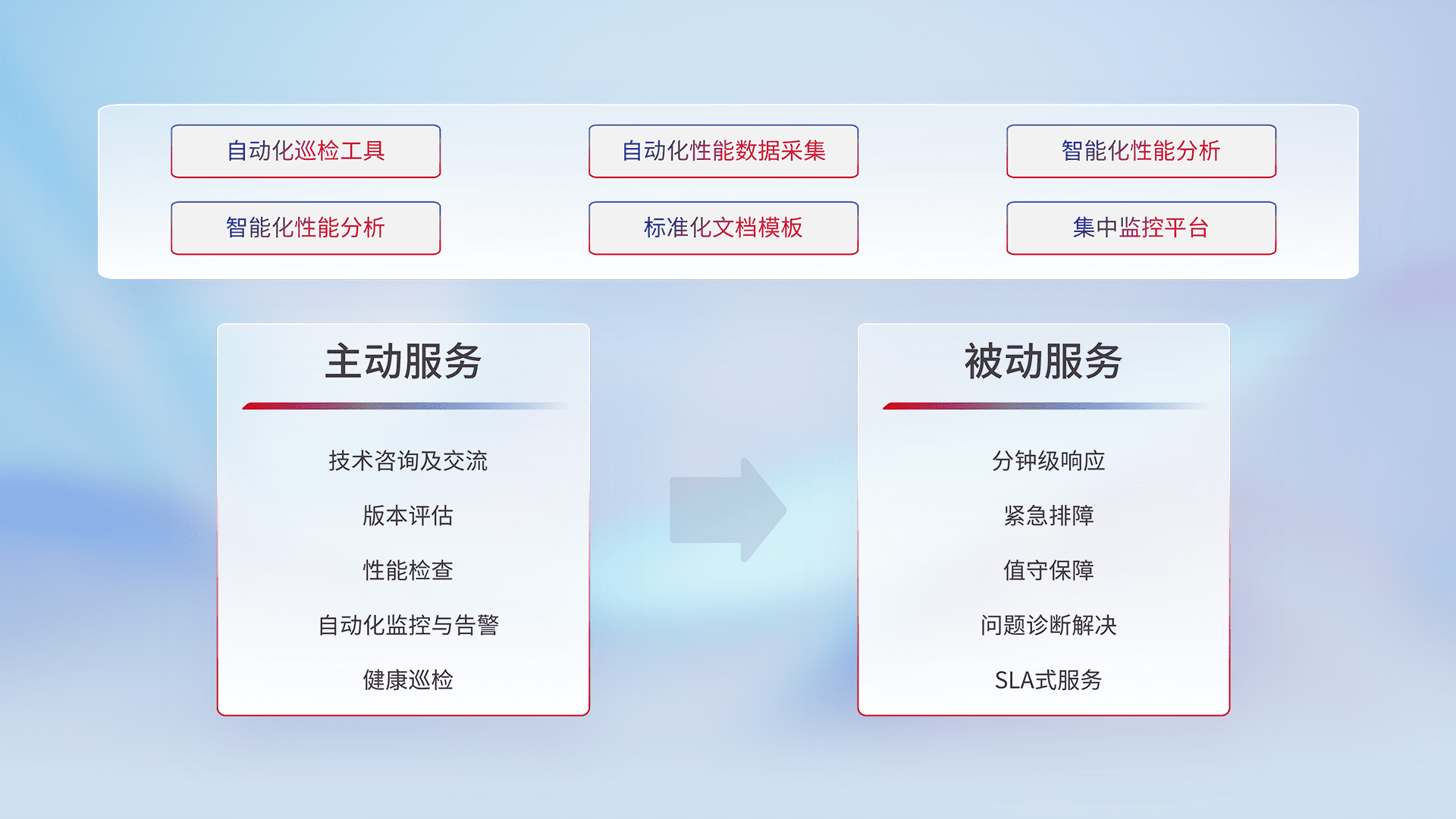 智能化工具和标准化文档,,,保障服务质量,,,提供主动服务(包含技术咨询、、版本评估、、、、性能检查、、、、自动化监控与告警、、、、健康巡检)和被动服务包含(分钟级响应、、、、紧急排障、、、、值守保障、、、问题诊断解决、、、、SLA服务)。。。